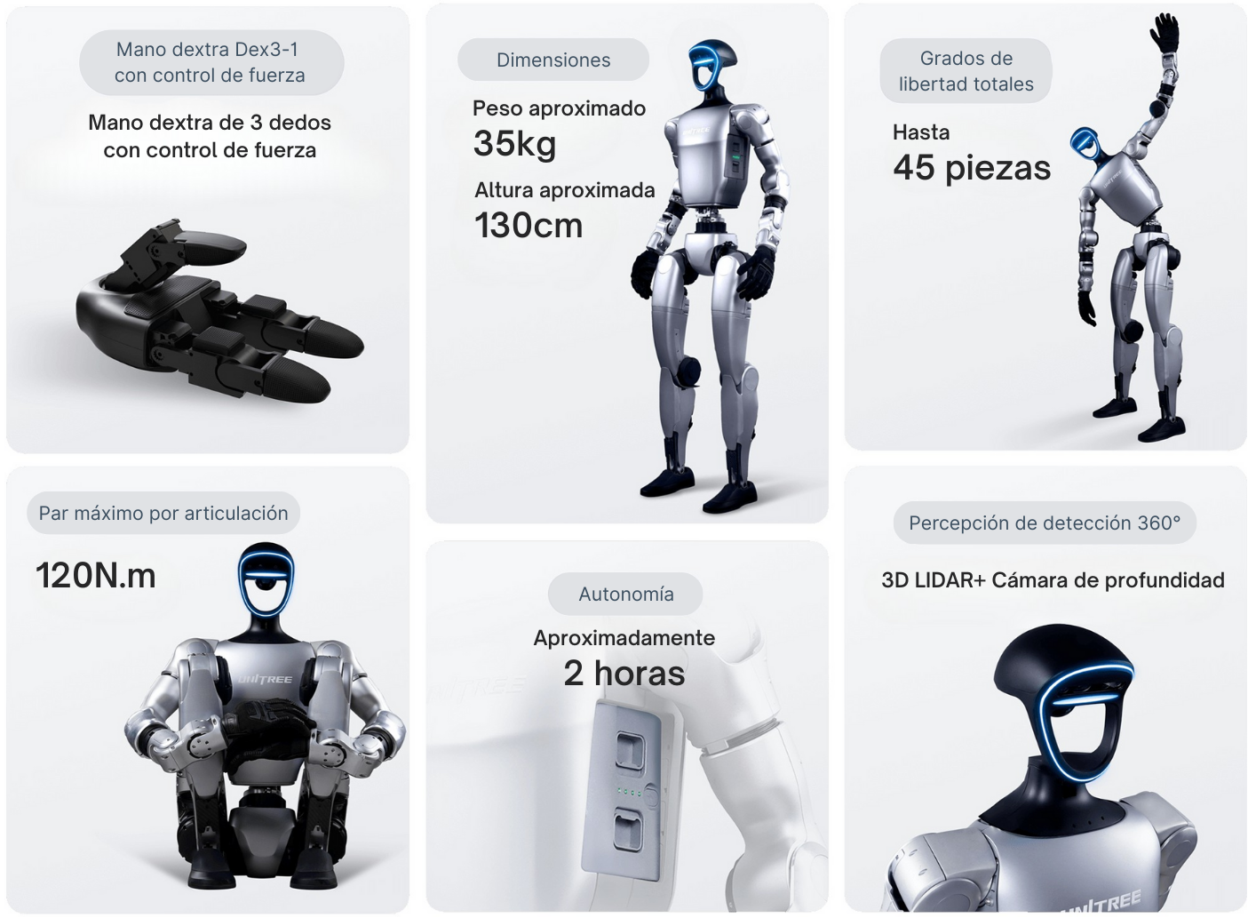 La mano opcional Dex3-1 ofrece control híbrido de fuerza y posición. Puede girar una llave, sostener un objeto frágil o ensamblar componentes con precisión milimétrica.
